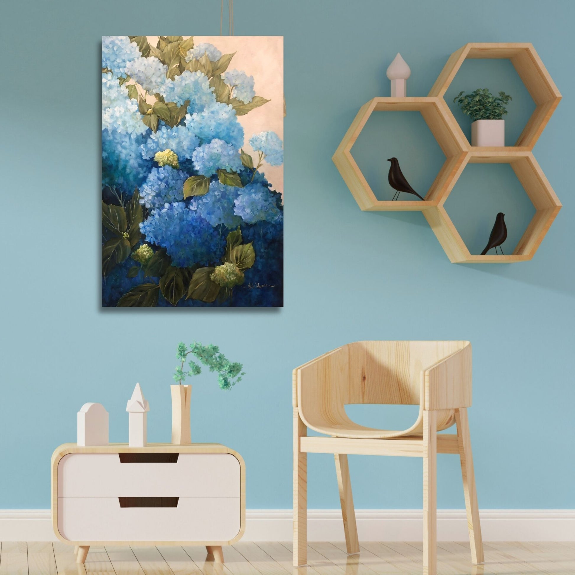 Azure is a painting that feels like a deep breath — rich, layered, and full of quiet light. Nola Weber’s work carries a natural grace, and here the shades move from depth to softness, offering both grounding and uplift. It’s a piece that feels alive yet calming, like a reminder of nature’s steady rhythm.