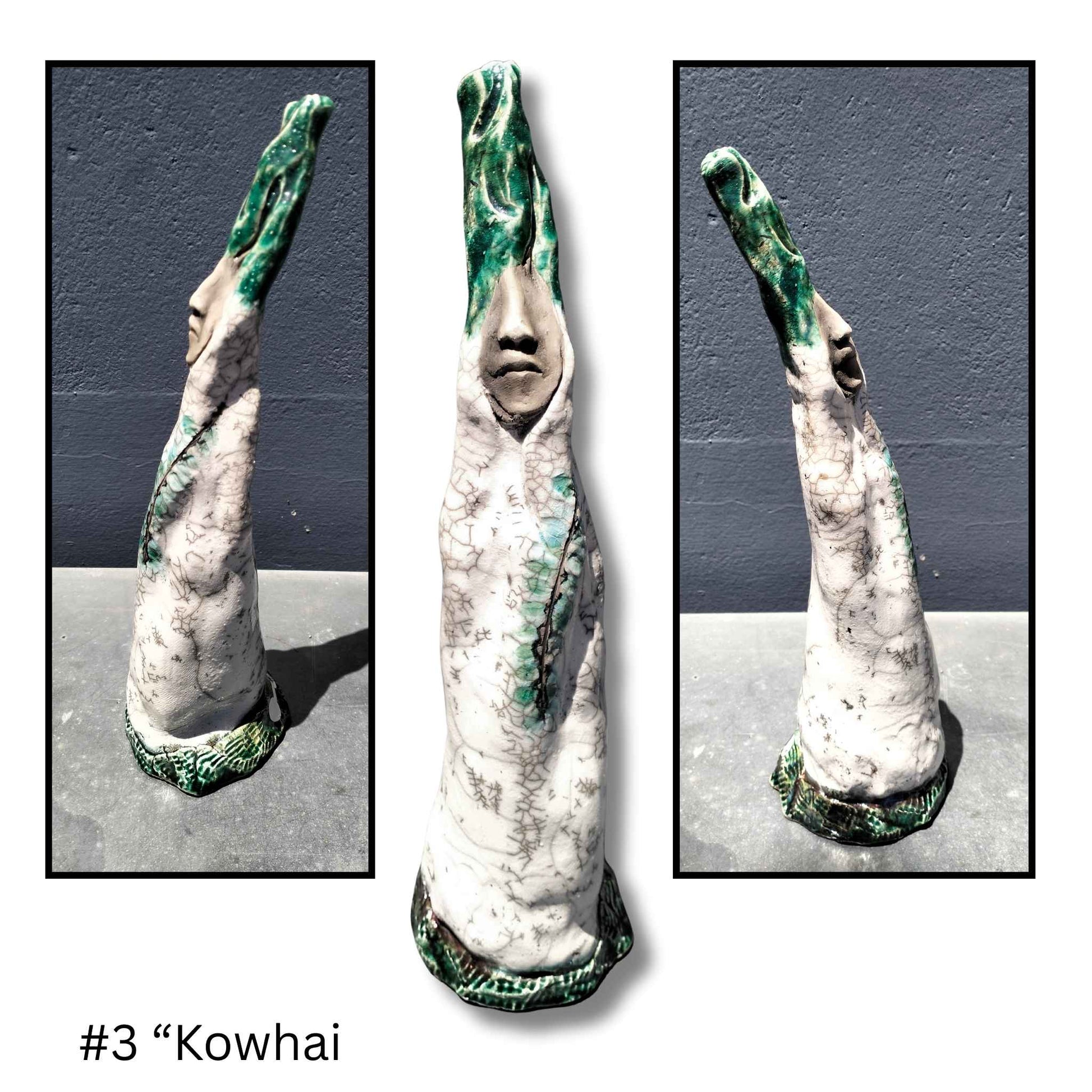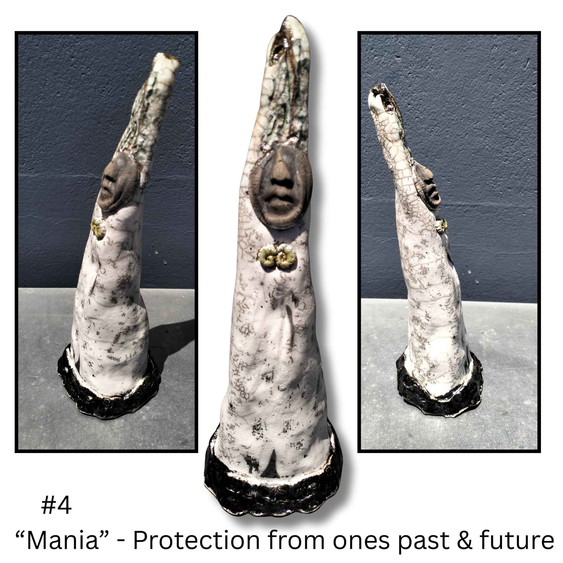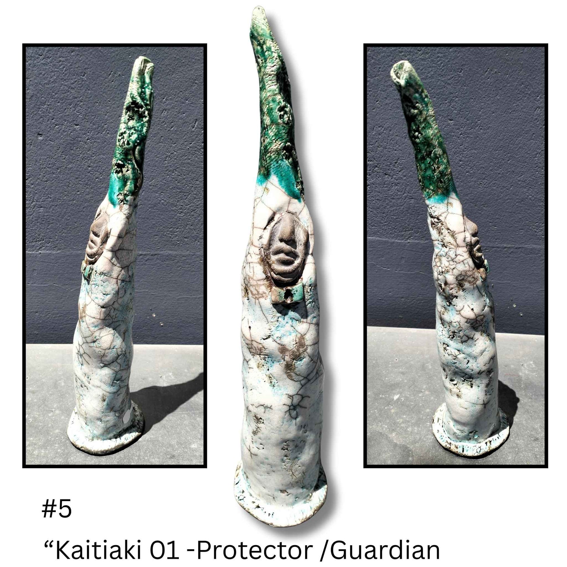 Some things are meant to watch over you. Chris Dunn's Iti protectors are hand-formed white porcelain guardians, Raku-fired with clear and copper glazes that create stunning crackled surfaces in cream, turquoise, and gold. Each hollow cone-shaped vessel tapers upward to reveal a face emerging from the clay—wrapped, sheltered, quietly present.