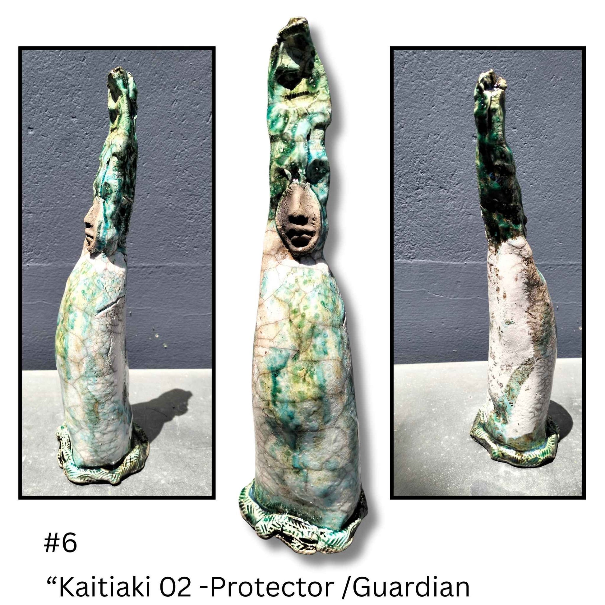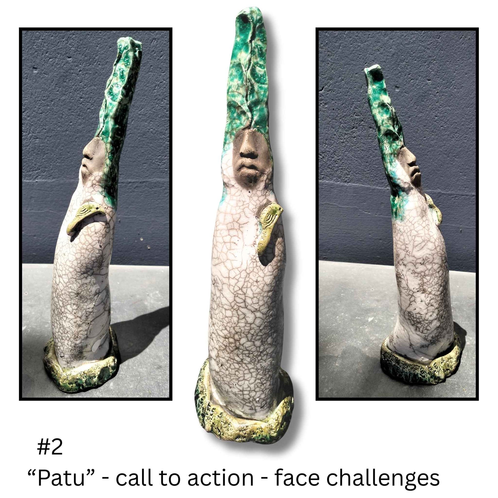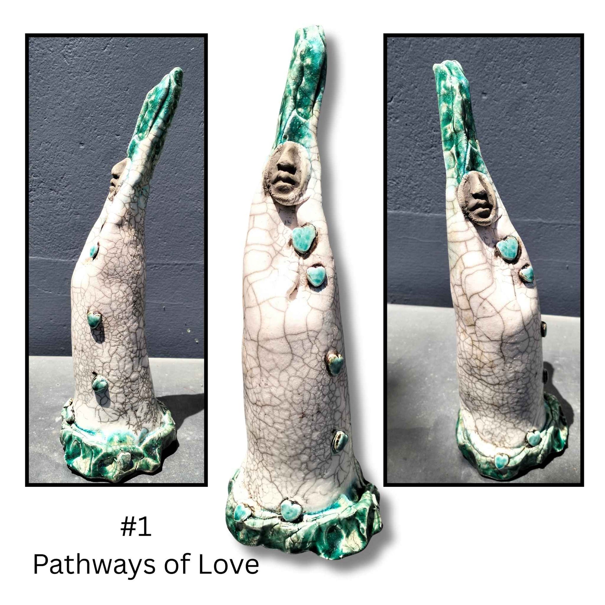 Some things are meant to watch over you. Chris Dunn's Iti protectors are hand-formed white porcelain guardians, Raku-fired with clear and copper glazes that create stunning crackled surfaces in cream, turquoise, and gold. Each hollow cone-shaped vessel tapers upward to reveal a face emerging from the clay—wrapped, sheltered, quietly present.