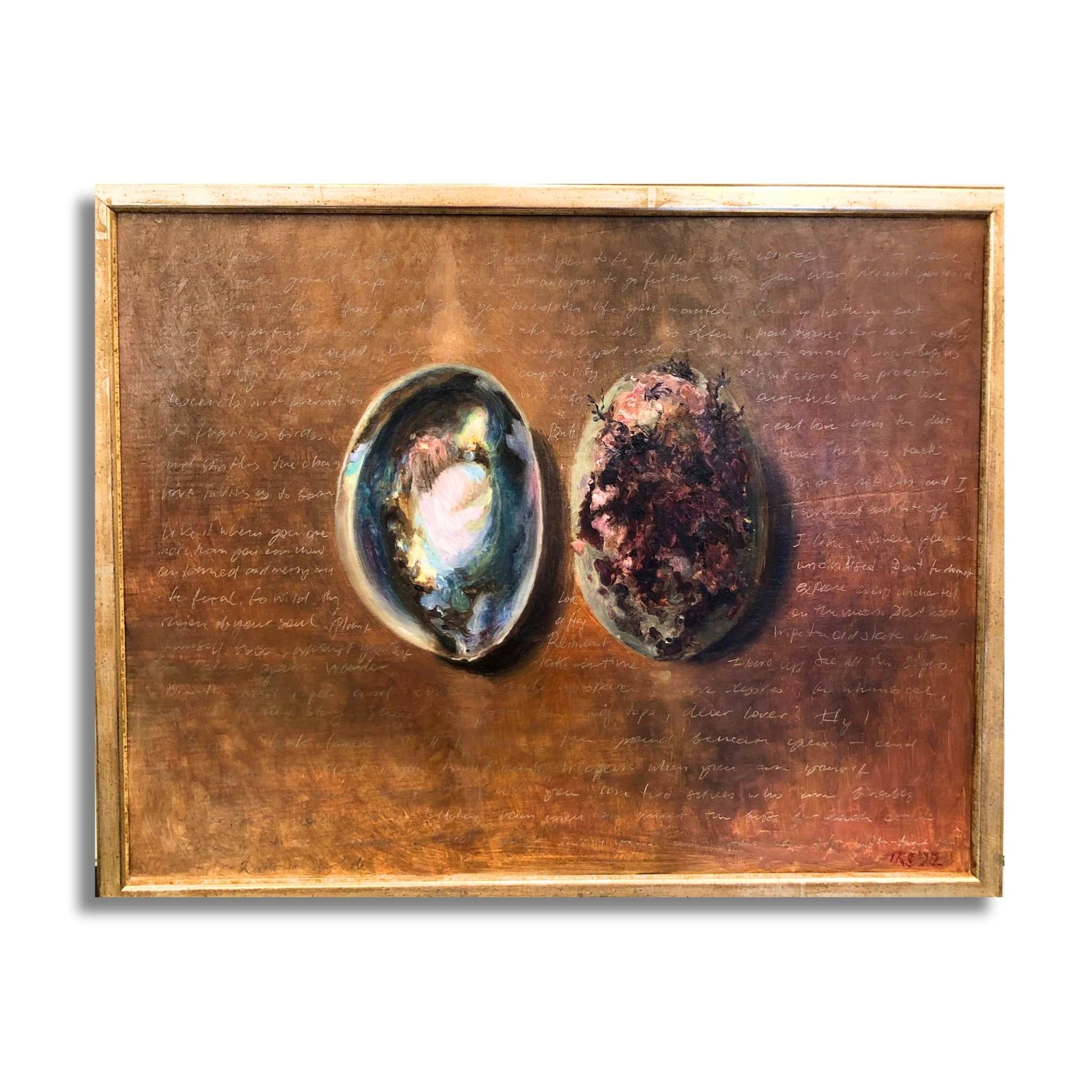 There are love letters, and then there's this. A paua shell—iridescent, oceanic, impossibly beautiful—paired with its rough, unpolished other half, all set against a backdrop of handwritten words that feel like they were meant for someone specific. It's tender and raw and achingly romantic.