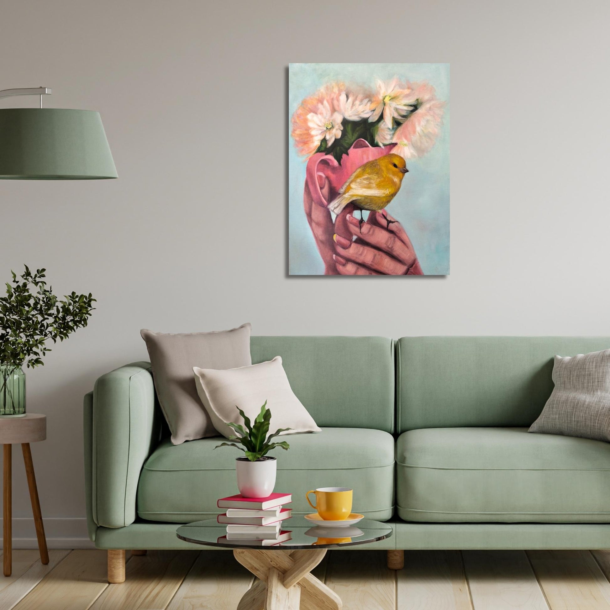 This portrait captures that moment of relief, of gratitude, of quiet strength. A woman holds her fathers canary close, both of them alive, both of them breathing. It's a story of resilience, of making it through, of the small bright things that keep us going.