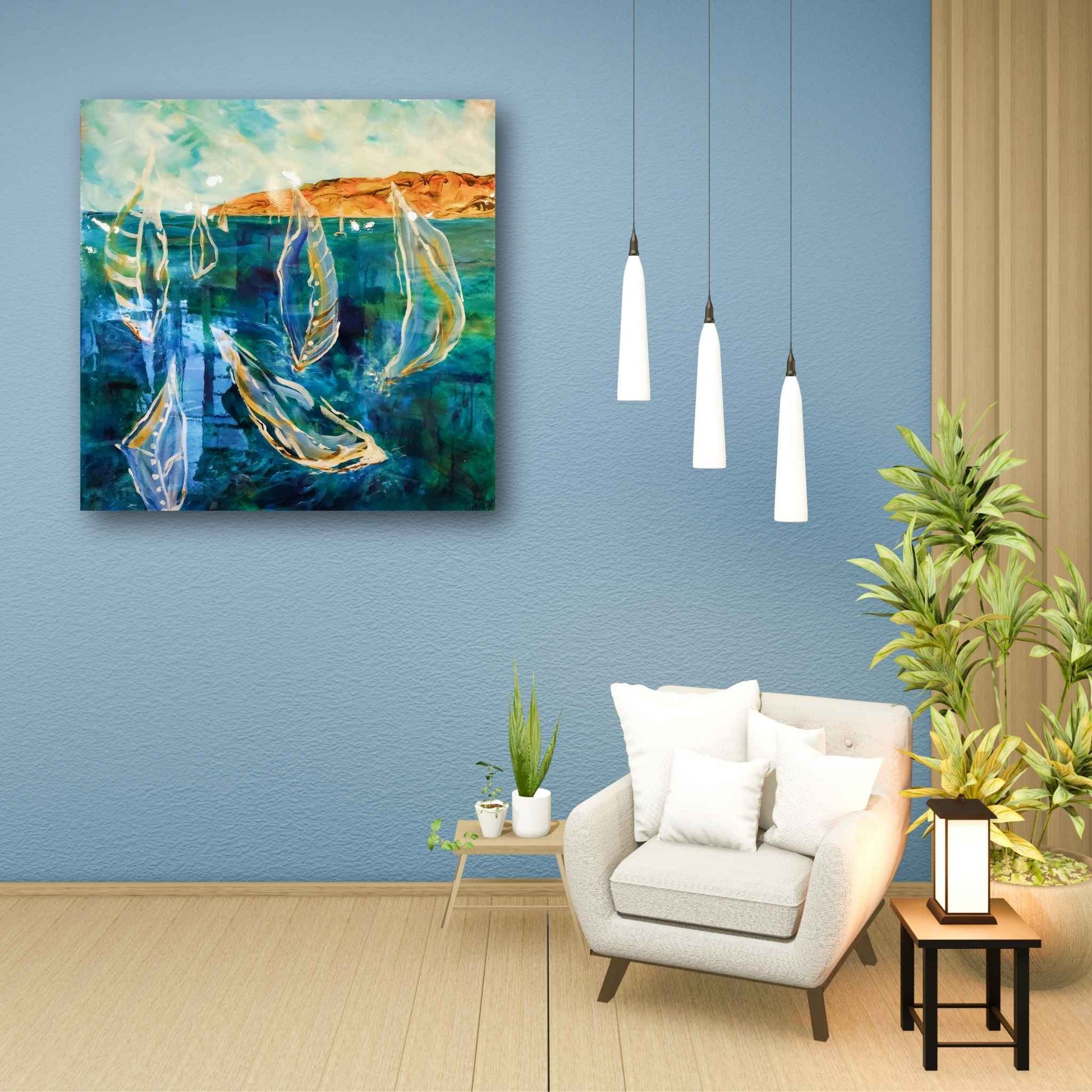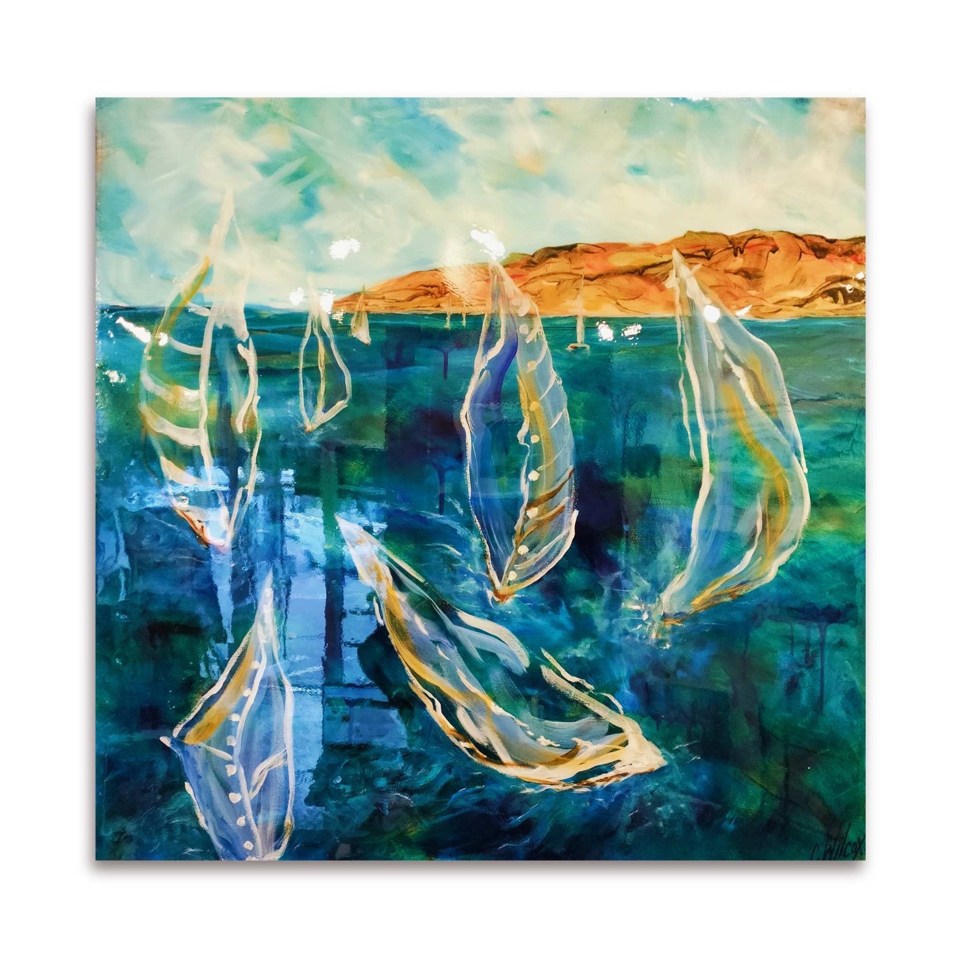 Dive into the tranquil yet dynamic world of Clare Wilcox’s Yesterday’s Sea. This bold acrylic painting features yachts resembling leaves sailing across a calm blue sea with a distant warm ochre horizon.